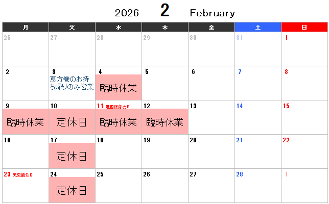 (お休みの日に営業した場合、他の日に臨時休業となる場合があります。)